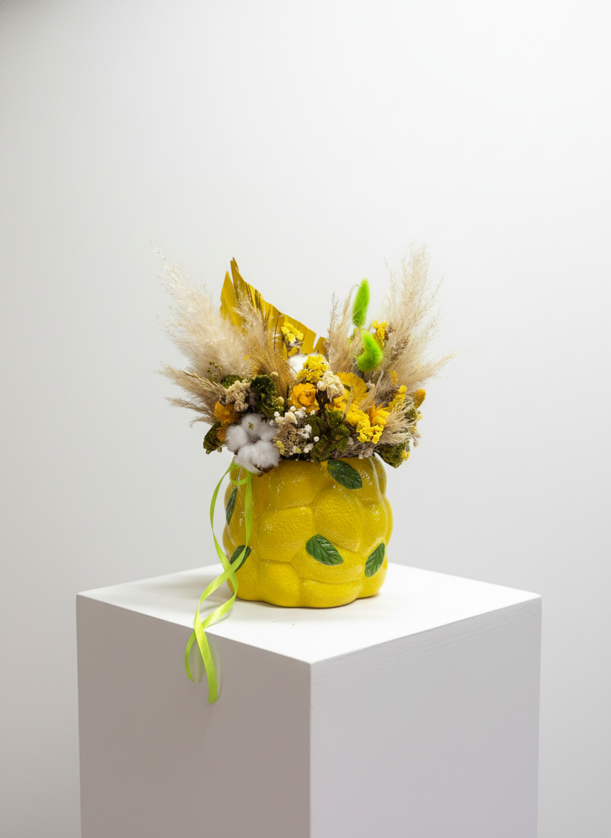 Bring a burst of sunshine into your space with the Golden Meadow Bloom Vase — a playful yet elegant arrangement designed to brighten any room. Set in a textured, citrus-inspired yellow vase, this piece blends soft pampas grass, delicate dried florals, and cheerful yellow accents for a fresh, modern look.
