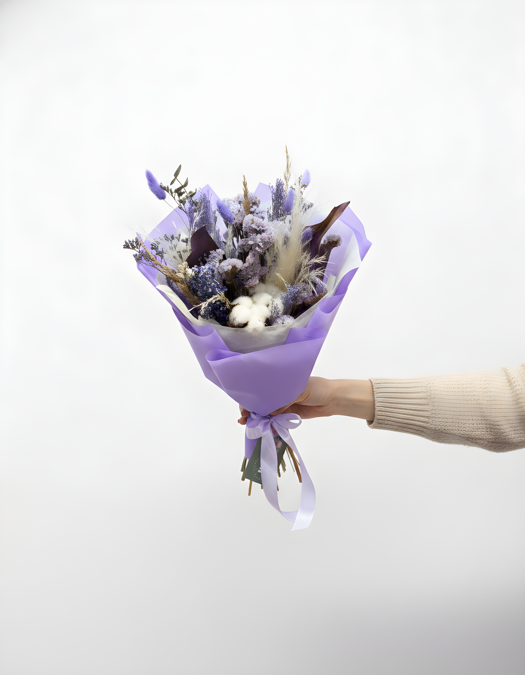 Delicate and enchanting, the Lavender Whisper Dried Bouquet is a timeless floral arrangement designed to bring soft elegance to any space. Featuring a harmonious blend of preserved lavender tones, this bouquet includes textured dried florals such as lavender sprigs, cotton blooms, bunny tails, and natural grasses. Wrapped in premium lilac paper and finished with a matching satin ribbon, it offers a refined and romantic aesthetic.